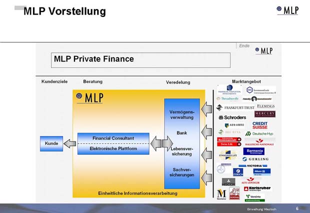 Dazu werden aus Modulen, die MLP am Markt einkauft und zu innovativen Konzepten veredelt, individuelle Lösungen entwickelt. Produktverkauf gehört bei MLP längst der Vergangenheit an. MLP Beratung ist umfassend. Zur Zielplanung gehören Vermögensbildung und -verwaltung, der sinnvolle Einsatz von Darlehen und nätürlich die Absicherung der Arbeitskraft und der Vermögenswerte.